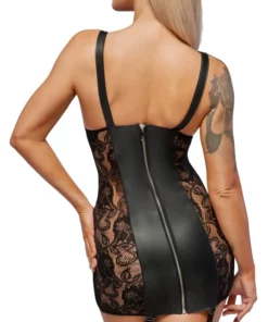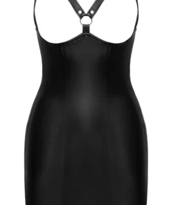 Przod sukienki posiada odkryty fason z efektownymi, skorzanymi paskami otaczającymi gorną część tułowia. Tył modelu przyciąga wzrok szerokimi, elastycznymi wstawkami z miękkiej koronki oraz zamkiem błyskawicznym, ktory ułatwia zakładanie i zdejmowanie produktu. Sukienka została wyposażona w regulowane szelki, ktore można dostosować do własnych potrzeb za pomocą wygodnych sprzączek. Dodatkowo model posiada cztery odpinane, regulowane paski do pończoch, umożliwiające tworzenie rożnorodnych stylizacji.