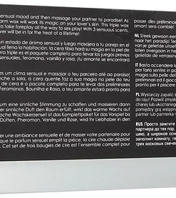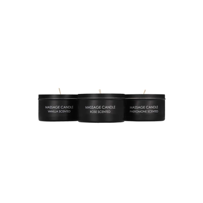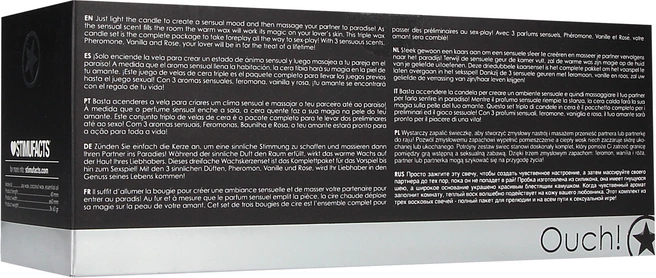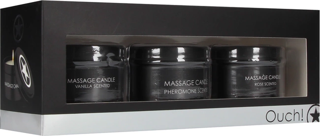 Ouch! by Shots – Zestaw Świec do Masażu Wanilia-Roża-Feromony 3x60g to wyjątkowy pakiet trzech świec stworzonych z myślą o relaksującym masażu i budowaniu atmosfery odprężenia. Każda świeca została umieszczona w eleganckim czarnym pojemniku, ktory doskonale komponuje się z nowoczesnym wnętrzem. Zestaw obejmuje trzy wyraziste kompozycje zapachowe: wanilia, roża oraz nuty feromonowe, zapewniając rożnorodność podczas każdego spotkania.